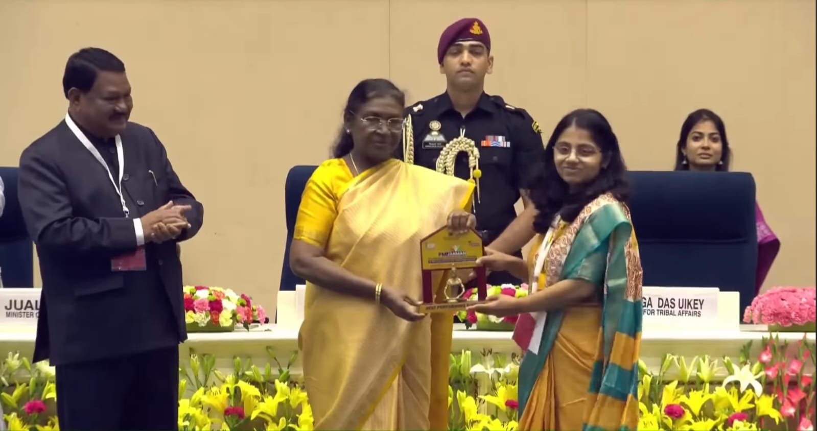 કેન્દ્ર સરકારના આદિજાતિ બાબતોના મંત્રાલયના ઉપક્રમે નવી દિલ્હી ખાતે ભારતના રાષ્ટ્રપતિ શ્રી દ્રોપદી મુર્મુના અધ્યક્ષસ્થાને “આદિ કર્મયોગી અભિયાન અંગેની નેશનલ કોન્કલેવ”નું આયોજન કરવામાં આવ્યું હતું. રાષ્ટ્રપતિ શ્રી મુર્મુના હસ્તે ‘પ્રધાનમંત્રી જનજાતીય આદિવાસી ન્યાય મહા અભિયાન’-PM-JANMAN હેઠળ સમગ્ર દેશમાં ‘બેસ્ટ પર્ફોર્મિંગ રાજય’ તરીકે ગુજરાતને એવોર્ડ એનાયત કરવામાં આવ્યો હતો. આ એવોર્ડ ગુજરાત સરકાર વતી આદિજાતિ વિકાસ વિભાગના અગ્ર સચિવ શ્રી શાહ મીના હુશેને સ્વીકાર્યો હતો.