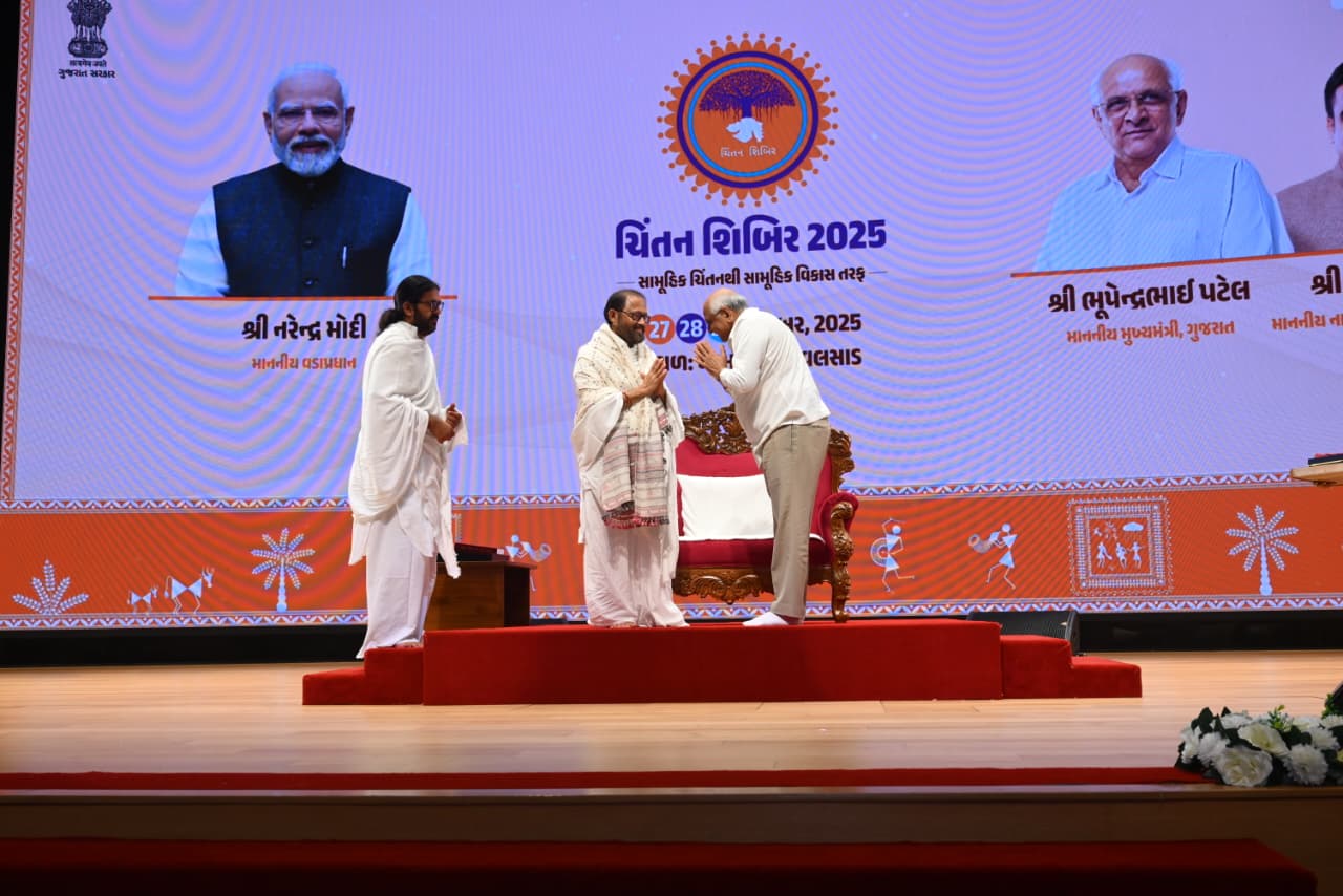 “સામૂહિક ચિંતનથી સામૂહિક વિકાસ તરફ” થીમ આધારિત ૧૨મી ચિંતન શિબિરમાં ધરમપુરના શ્રીમદ્દ રાજચંદ્ર આશ્રમ ખાતે રાજસભા ગૃહમાં શ્રીમદ્ રાજચંદ્ર મિશન-ધરમપુરના સ્થાપક પૂ. ગુરૂદેવ શ્રી રાકેશજીએ આધ્યાત્મિક પ્રવચનમાં સનદી અધિકારીઓને જનસેવાની ઉત્તમ તક મળી છે, ત્યારે આ તકને ઉચ્ચ ક્ષમતા વિકસાવીને સમાજના નાના માણસોને મદદરૂપ બનવા જણાવ્યું હતું. તેમણે જીવનમાં ઉતારવા જેવી ચાર શીખ આપી હતી સાથે જ તનાવમુક્ત જીવન જીવવા માટે મનનીય અને ગહન વિચારો વ્યક્ત કર્યા હતા. મુખ્યમંત્રીશ્રી સહિત મંત્રીમંડળના સભ્યો અને સનદી અધિકારીઓએ પ્રવચનને માણ્યું હતું.