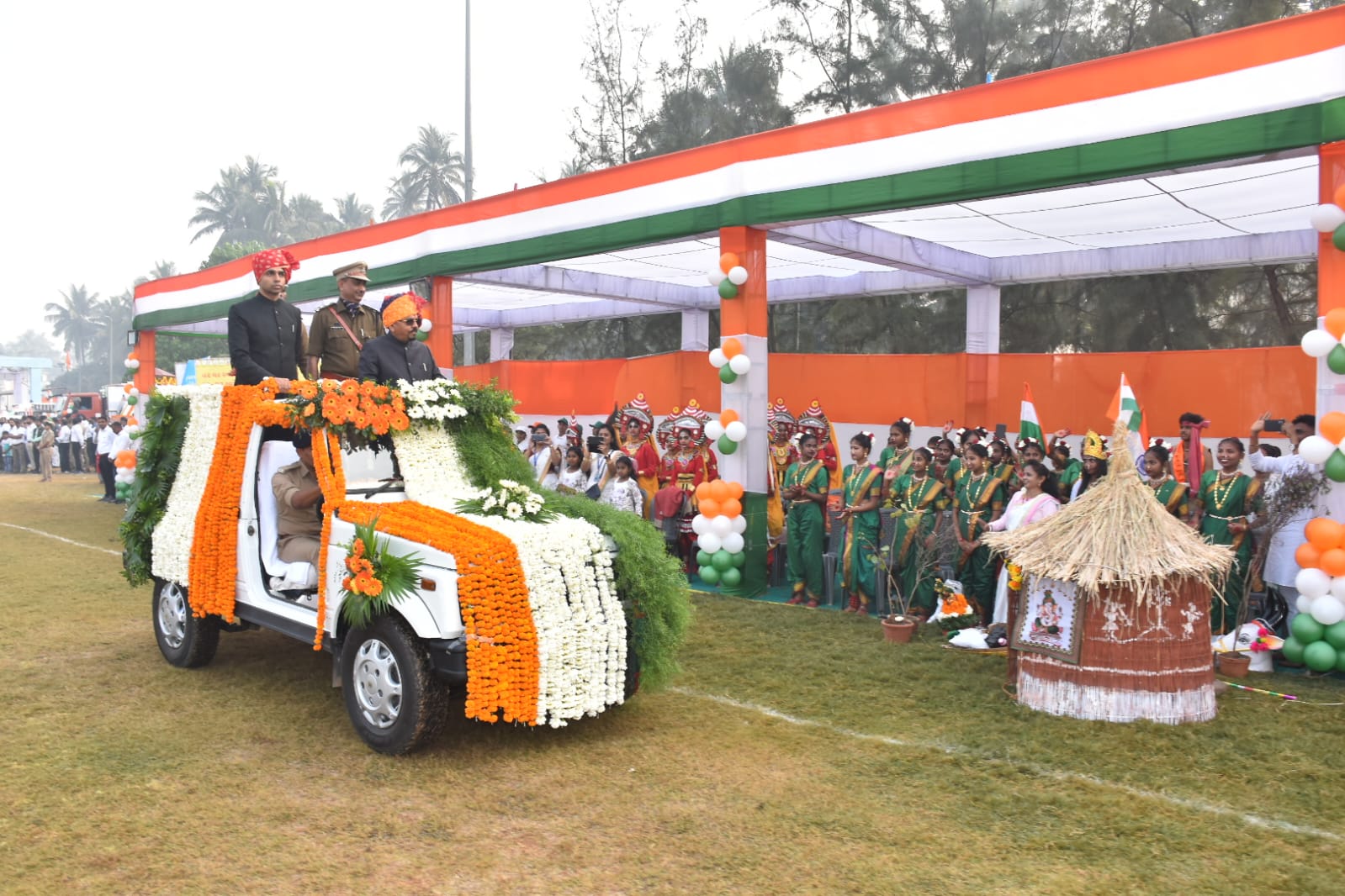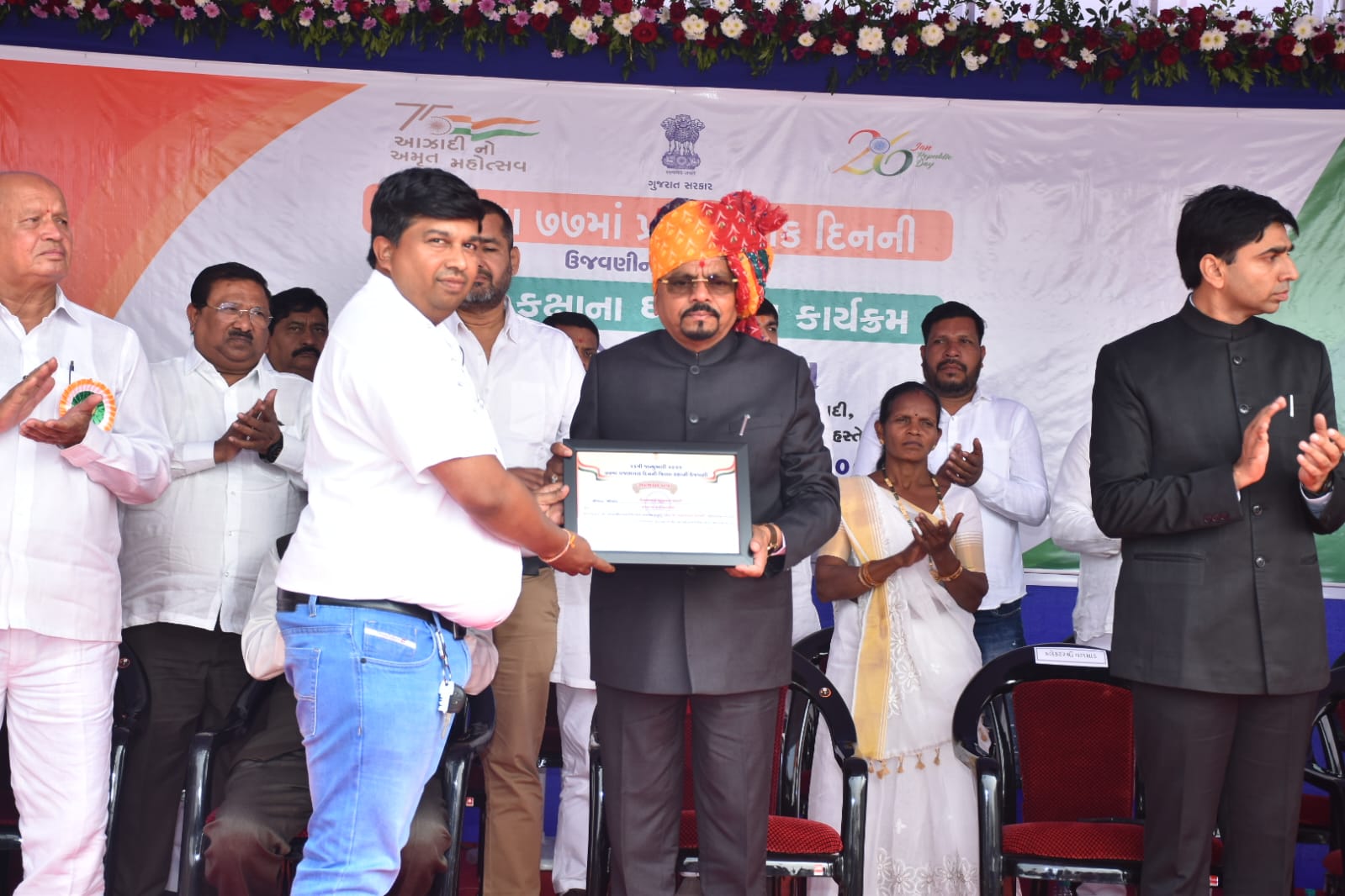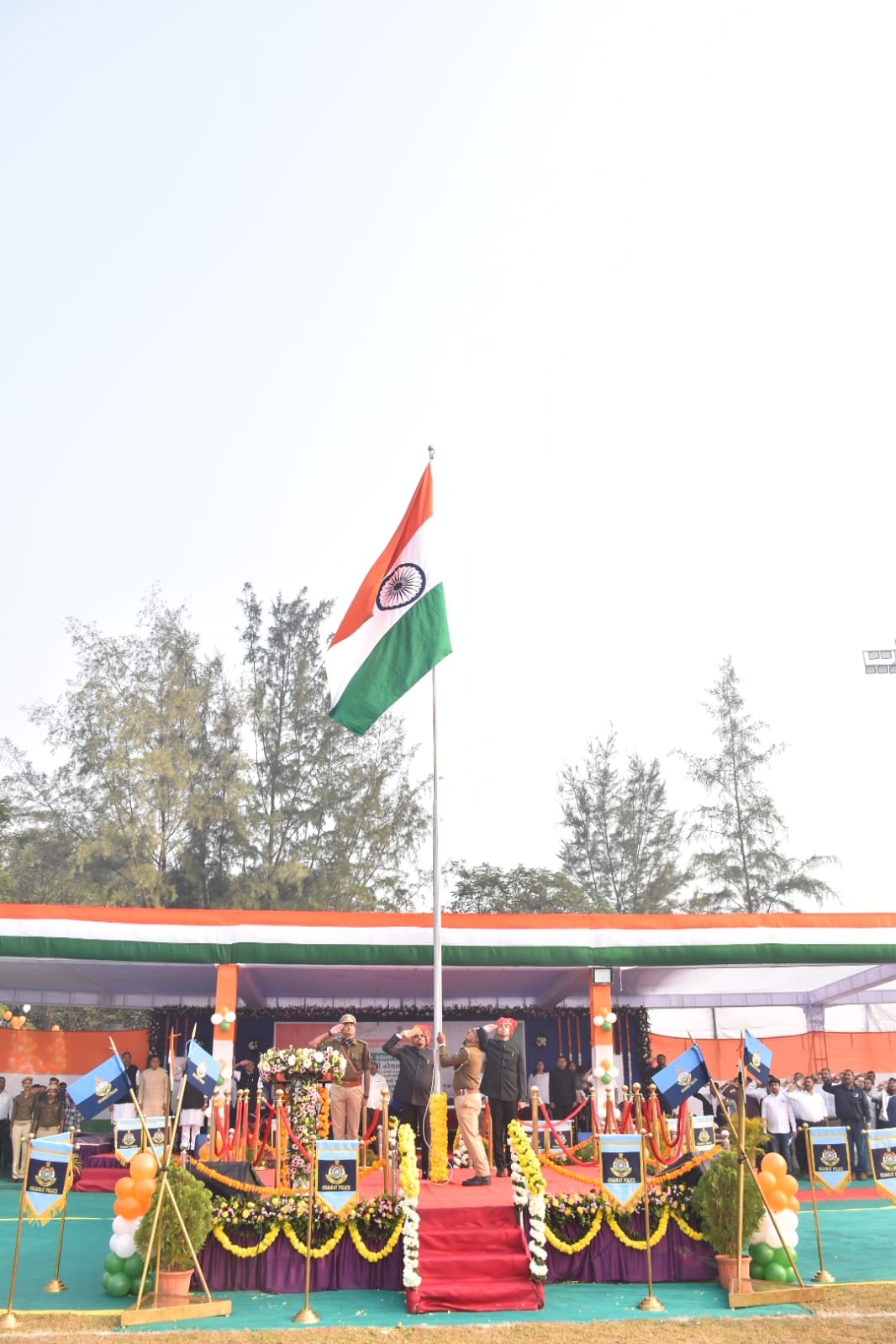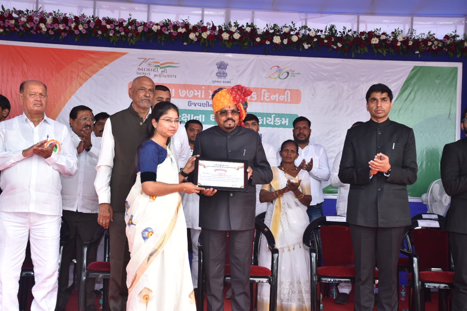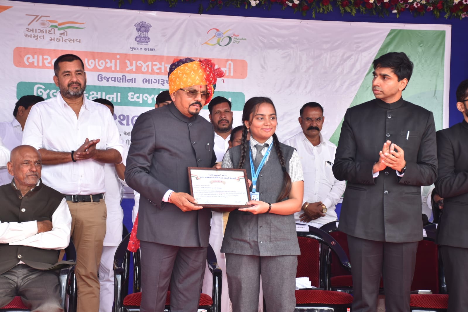 વલસાડ જિલ્લામાં ૭૭માં પ્રજાસત્તાક દિનની જિલ્લા કક્ષાની ઉજવણી ઉમરગામ તાલુકામાં સર્કિટ હાઉસની પાસે આવેલા નગરપાલિકાના ક્રિકેટ ગ્રાઉન્ડ ખાતે દેશભક્તિના માહોલ સાથે થઈ હતી. આ પ્રસંગે રાજ્યના આદિજાતિ વિકાસ, ખાદી, કુટીર અને ગ્રામોદ્યોગ વિભાગના કેબિનેટ મંત્રીશ્રી નરેશભાઈ પટેલે ધ્વજવંદન કરી દેશની આન, બાન અને શાન સમાન રાષ્ટ્રધ્વજને સલામી આપી હતી.